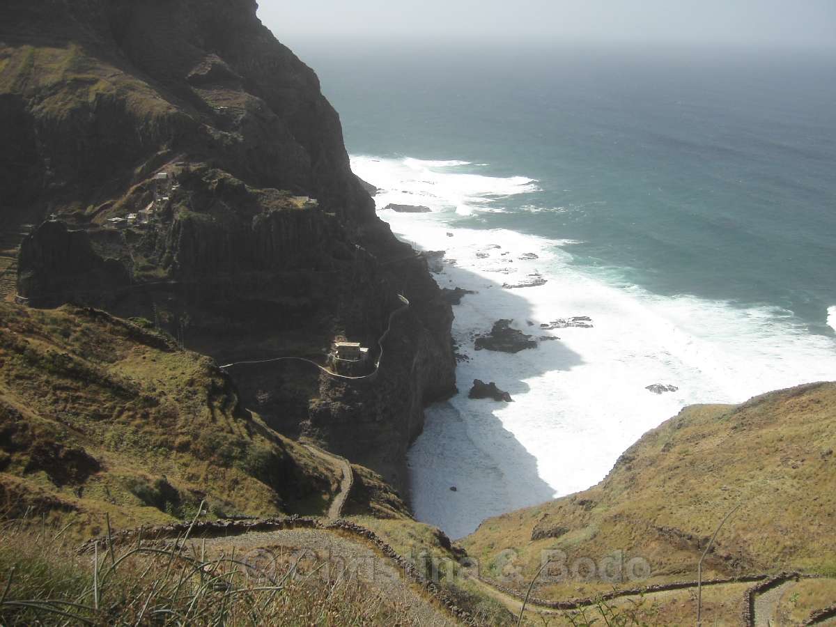 Gerade auf Santo Antao hat uns die Landschaft fasziniert und der Blick von der Terrasse im Pedracin Village wird uns unvergesslich bleiben. Direkt vom Hotel aus konnten wir bei längeren und kürzeren Wanderungen wunderbare Einblicke in den grünen Norden der Insel gewinnen und haben dabei immer wieder sehr nette Kontakte zu den Einwohnern gehabt. Spektakulär schön fanden wir auch die Küstenwanderung von Cha di Igreja nach Ponta do Sol. Die Cinque Terre erscheinen im Vergleich nur wie ein müder Abklatsch. Leider ist es uns nicht gelungen herauszufinden, warum dieser Weg angelegt wurde. Wir vermuten, dass dies militärische Gründe hatte.