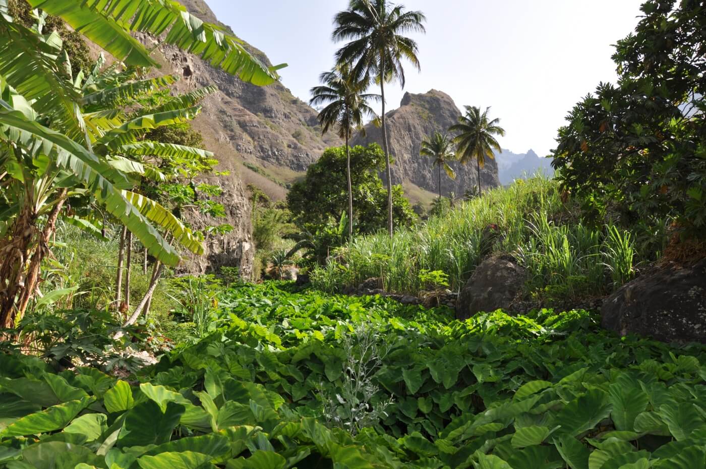 Mit der Morgenfähre setzen Sie über nach Santo Antão. Mit dem Taxi fahren Sie durch das Inselinnere hoch in die Berge bis zum Cova-Krater. Wenn Sie möchten, fährt Ihr Gepäck alleine weiter und Sie wandern durch das Tal von Paúl direkt zu Ihrer Unterkunft.