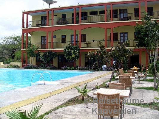 Schöne Aussenanlage mit großem Pool, Bar und herrlichem Blick auf Brava. Ein idealer Treffpunkt zum Sonnenuntergang. Restaurant, Rezeption mit Internet, Kiosk, kostenfreies Wlan.